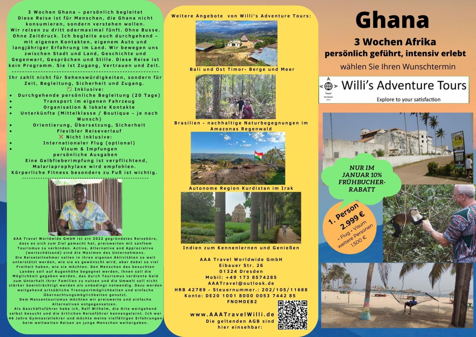 AAA Travel Worldwide GmbH ist ein 2022 gegründetes Reisebüro, dass es sich zum Ziel gemacht hat, preiswerte Reisen mit sanftem Tourismus zu verbinden. Active, Alternative and Appreciative (wertschätzend) sind die Maximen. Den Menschen des besuchten Landes soll auf Augenhöhe begegnet werden, ihnen soll die Möglichkeit gegeben werden, das durch Tourismus verdiente Geld zum Unterhalt ihrer Familien zu nutzen und die Umwelt soll nicht stärker belastet werden als unbedingt notwendig. Dazu werden weitgehend ortsübliche, Transportmöglichkeiten und einfache, durch die Besitzer geführte Übernachtungsmöglichkeiten genutzt. Ich möchte dem Massentourismus Alternativen entgegensetzen. Meine Reiseteilnehmer sollen in ihren eigenen Aktivitäten so weit unterstützt werden, wie es gewünscht wird, aber so viel Freiheit haben, wie sie möchten.