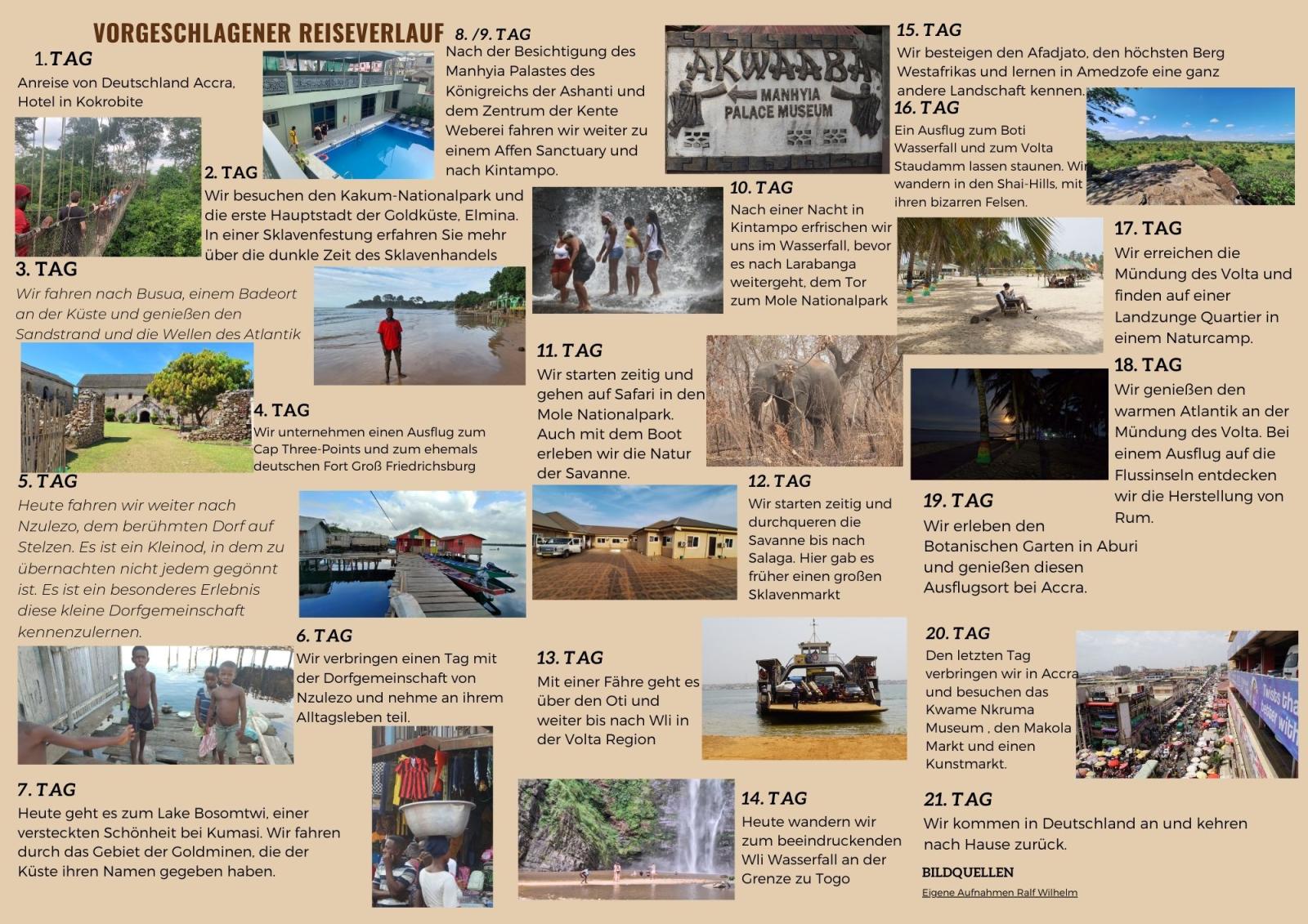 Die Reise führt zu den schönsten Orten der ehemaligen Goldküste in Westafrika. Sie erleben historische Stätten und ursprüngliche Natur, die bunte Vielfalt afrikanischer Märkte, quirlige Großstädte und die Schlichtheit des Lebens von Fischern und Kleinbauern, atemberaubende Naturschönheiten und modernes Leben. Sie tauchen ein in den Trubel der Küstenstädte, die Vielfalt des Regenwaldes und der Savanne mit ihren typischen Naturformen und Wildtieren. Viele Details sind in Absprache individuell anpassbar.